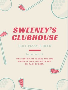 2 hours of golf, one pizza, 6 pack of beer at Sweeney's, $50 Cargo certficate. Donated by Sweeney's Clubhouse and Cargo (Sutherland)