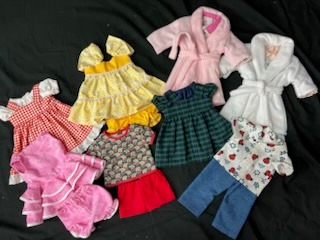 8 handmade outfits for 18" doll. Made and donated by Harriet Anderson