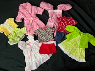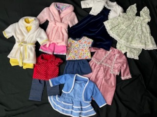 7 handmade outfits for 18" doll. Made and donated by Harriet Anderson