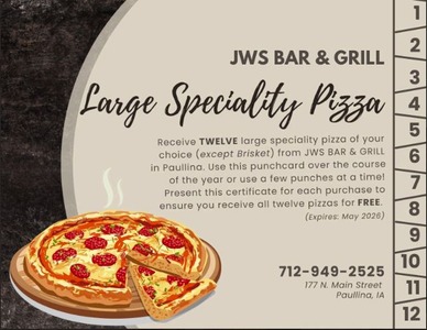 1 Large Speciality Pizza for 12 months (excludes Brisket pizza, expires May 2026) Donated by JWs (Paullina)