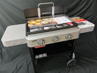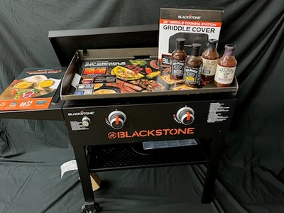 28" Blackstone Griddle with hardcover lid, side shelf, griddle cover, BBQ sauces x4. Donated by Tim & Wanda Pauling