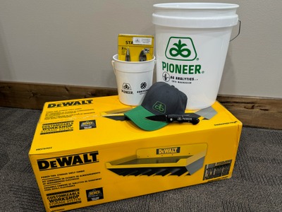 DeWalt Power Tool Storage Shelf Combo, Stanley Pliers Set, Pioneer hat and knife, buckets x2. Donated by Eric & Annaliese Magnussen (Pioneer Seed, Paullina)